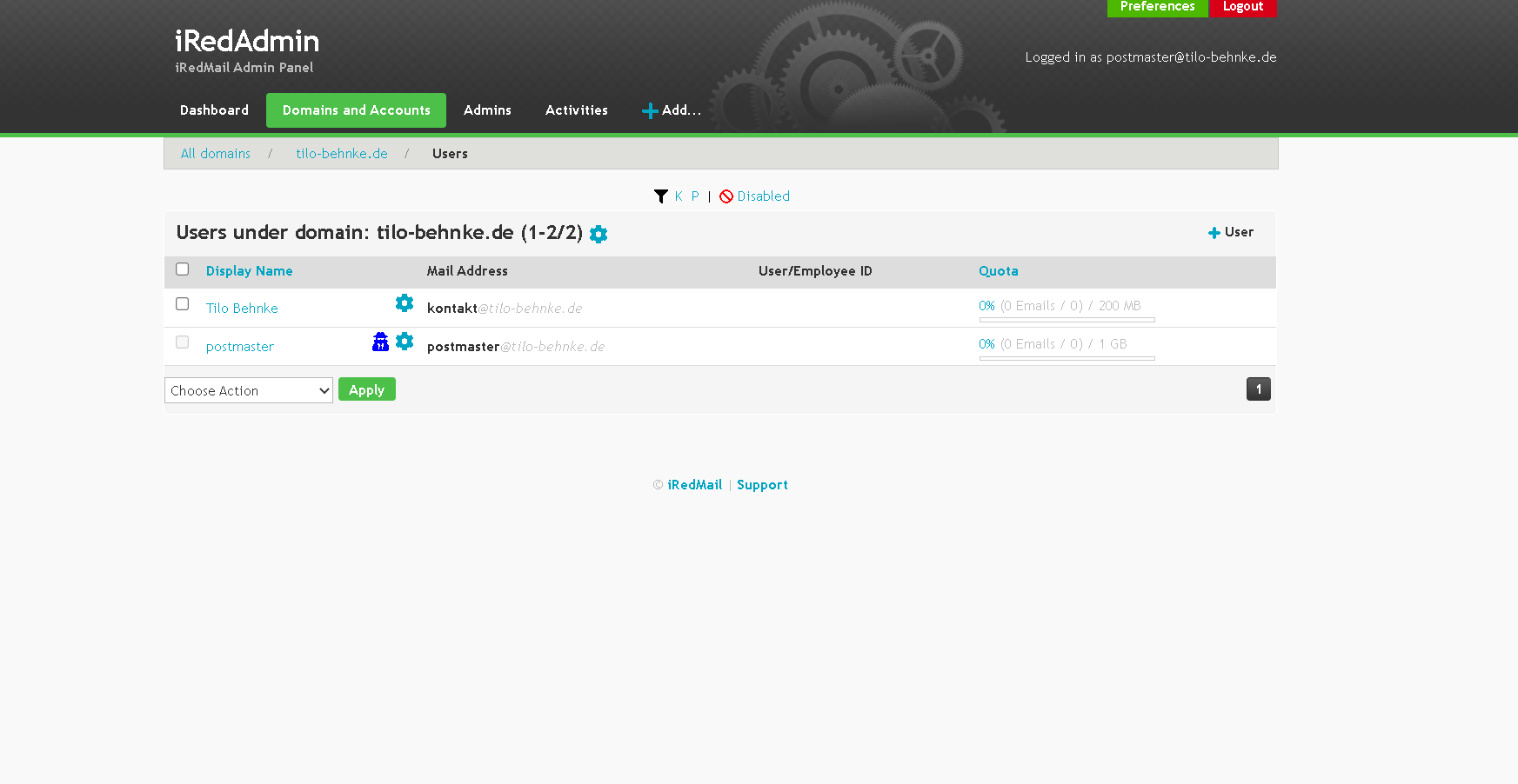 ICH HASSE DIESES PROGRAMM!!!! Ich hab 2 Stunden meiner Lebenszeit dafür investiert das zum Laufen zu bringen ohne Nignx zu Benutzen und jetzt bin ich total enttäuscht von dieser mickrigen schlecht gemachten Admin Oberflächte. Ich will einfach nur Emails von @tilo-behnke.de Email Adressen empfangen und verschicken können über meinen eigenen Server. Das kann doch nicht so schwer sein. Und Wie komme ich jetzt an die Emails dran???? in diesem komischen Admin Panel steht nichts dazu. Weder SMTP Verbindungsdaten noch ein EMail Web Panel. Und dabei soll dieses Iredadmin doch so super praktisch sein. Jetzt hab ich mir extra eine Domain nur fürs Email versenden gekauft und jetzt kann ich sie gar nicht benutzen.