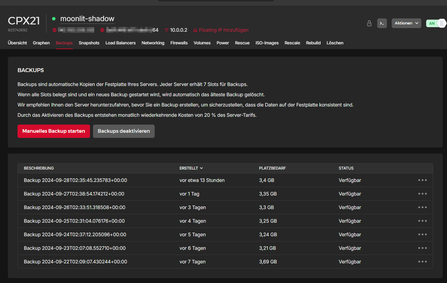 Backup via Hetzner-Storage Boxes und täglichen automatischen Backups.