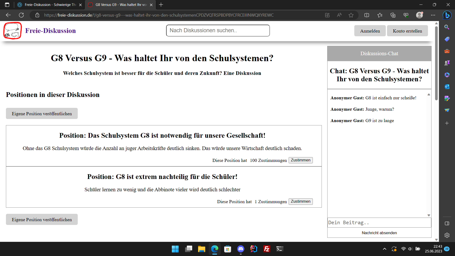 Ich möchte euch das Projekt Freie-Diskussion vorstellen! Dort kann jeder über alle möglichen Themen diskutieren und eigene Meinungen, Positionen und Argumente hinzufügen. Das Projekt ist meine erste vollständig funktionsfähige Web-Anwendung in Vanilla PHP und dem MCV-Aufbau Programmiert.
