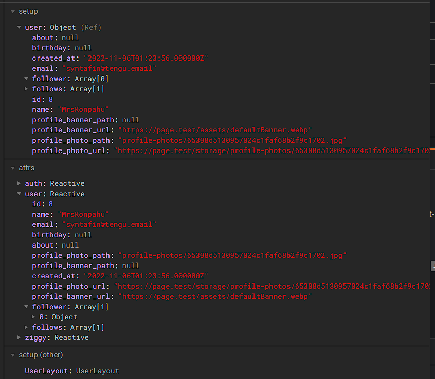 Da so dann statt v-for="item in user.follower" das ganze so schreiben muss: v-for="item in $page.props.auth.user.follower"
